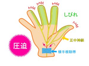 手根管症候群は、正中神経の圧迫(締めつけ)によって生じます。